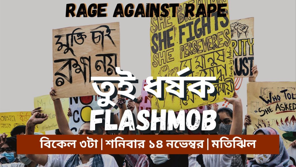 ধর্ষণের সংস্কৃতিকে ঘিরে আলোচনা এখনো ফুরিয়ে যায়নি। অন্তত ধর্ষক ও অপরাধী তৈরির কাঠামোটি ধ্বংস না হওয়া পর্যন্ত তা চলবে। আসুন, প্রতি শনিবার আমরা বিভিন্ন এলাকার রাস্তায় নেমে ফ্ল্যাশ মবের মাধ্যমে প্রতিবাদ করি। প্রতিবাদে আমরা চিলিতে রচিত “তুই ধর্ষক” শীর্ষক নারীবাদী যে বিখ্যাত প্রতিবাদী ধ্বনি পৃথিবীব্যপী আলোড়ন তুলেছিল তা পরিবেশন করব। এই শনিবার মতিঝিলে বেলা তিনটায় আপনাদের সাথে দেখা হবে। পরের শনিবার দেখা হবে অন্যস্থানে।