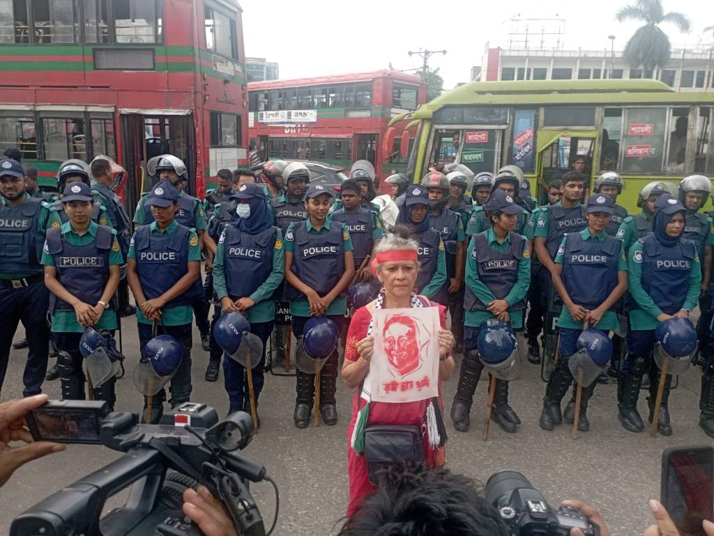 Prominent feminist activist, Rehnuma Ahmed, was holding a placard with a photo of the current Prime Minister Sheikh Hasina, and the words “STUDENT KILLER” in front of the police. The Prime Minister and police have been facing widespread criticism for their handling of student protests, which led to anti-government protests.