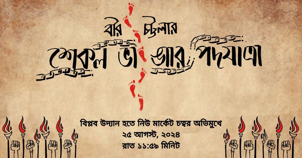 ২৫ অগাস্ট রাত ১১ টা ৫৯ মিনিট থেকে শুরু হবে শেকল ভেঙে সামনে এগিয়ে যাওয়ার আমাদের এই পদযাত্রা। ২ নং গেইট টু নিউমার্কেট চত্ত্বর রাস্তায় আমরা হাঁটবো, গলা উঁচিয়ে প্রতিবাদ করবো, গান গাইবো, রাতের অন্ধকার ভেদ করে সবাইকে জানিয়ে দেব আমাদের দাবীর কথা।