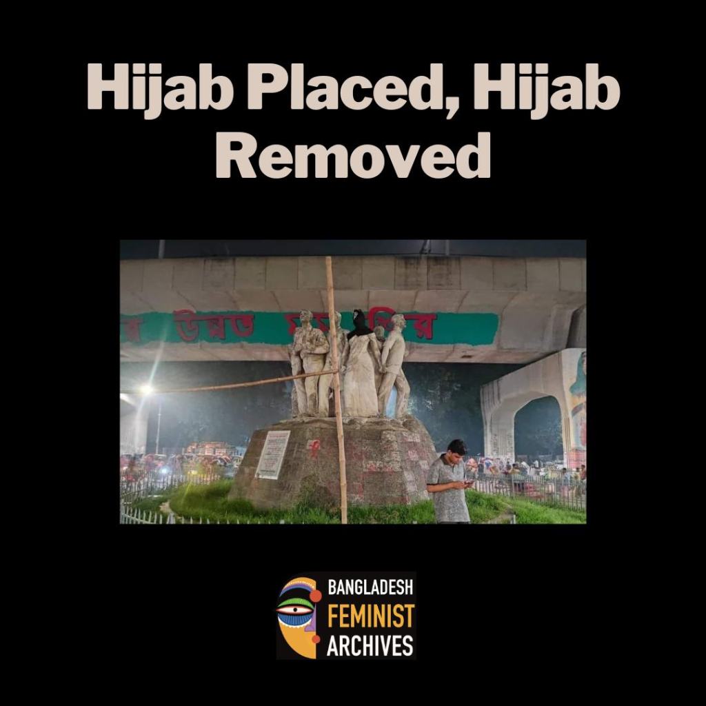 A group of unidentified youths placed a hijab on the female figure of the Raju Memorial Sculpture late Sunday.