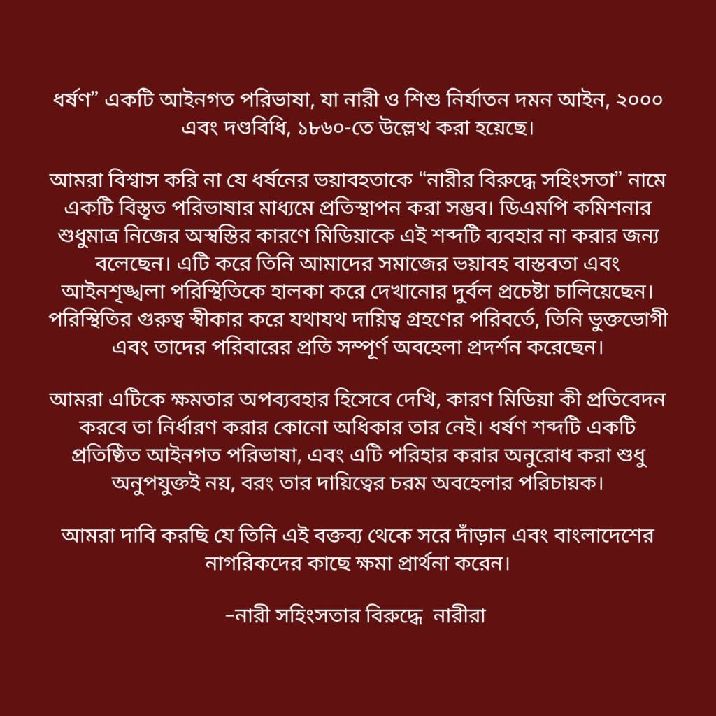 আমরা দাবী করছি, স্বরাষ্ট্র উপদেষ্টা জাহাঙ্গীর আলম চৌধুরীকে অবিলম্বে অপসারণ করা হোক। তার দায়িত্বহীন ও বিভ্রান্তিকর বক্তব্য জনমানুষের আস্থা নষ্ট করেছে। আমাদের দাবী, সকল শ্রেণি, ধর্ম, জাতি ও পরিচয়ের নারী যেন নিরাপদে ও নির্ভয়ে তাদের অধিকার চর্চা করতে পারে।