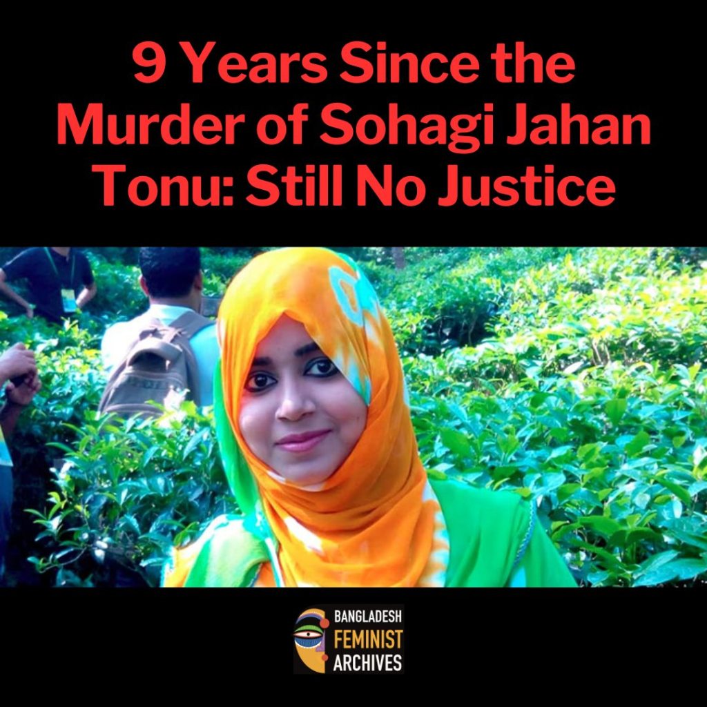 On March 20, 2016, the body of Sohagi Jahan Tonu, a student of Comilla Victoria Government College and a theatre activist, was recovered from the Mainamati Cantonment area. She had been brutally raped and murdered. Nine years have passed, yet no one has been held accountable.