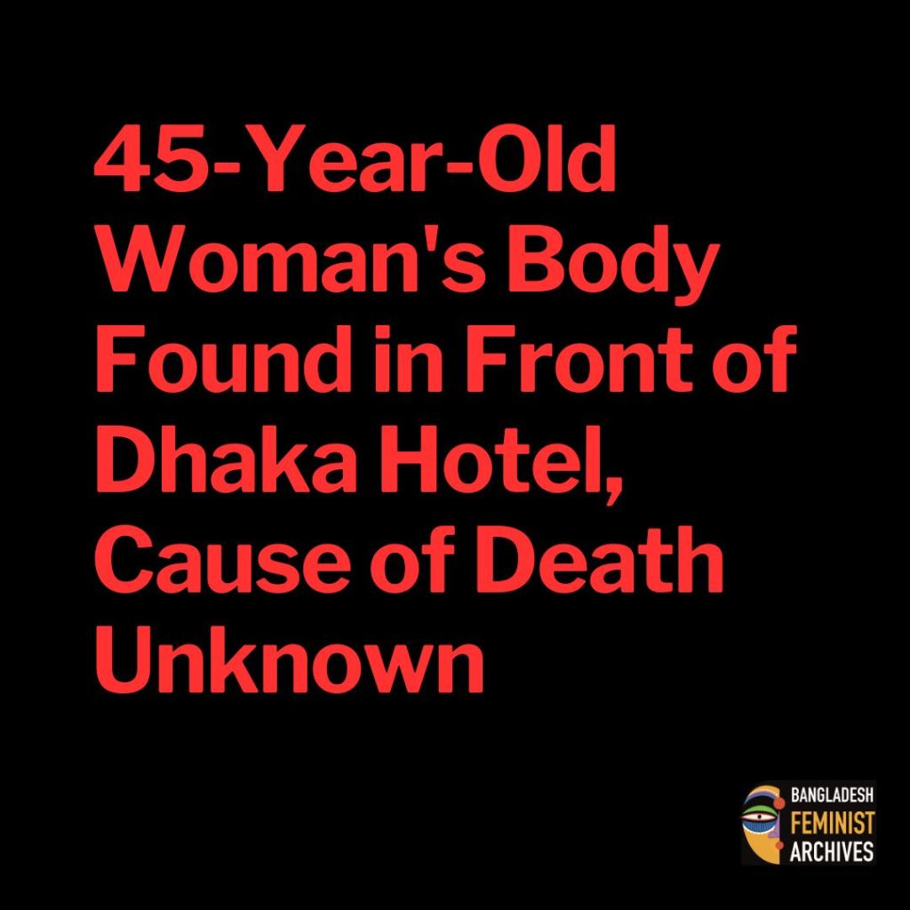A 45-year-old unidentified woman’s body was found in front of the Sonargaon Hotel under Hatirjheel police station in Dhaka.