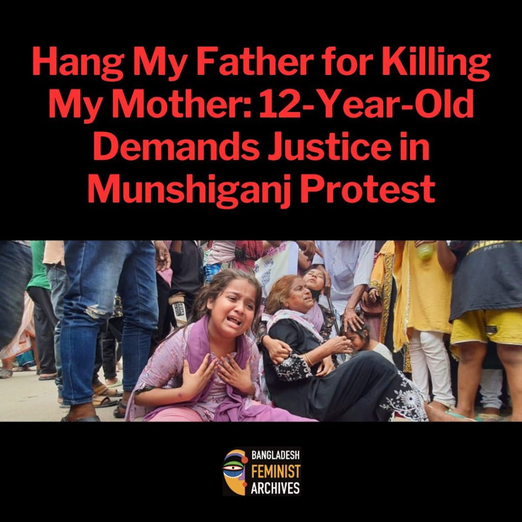 In Mirkadim Municipality of Munshiganj, a 12-year-old girl has publicly demanded the death penalty for her father, who murdered her mother, Mitu Akhter (28), by hacking her with a sharp knife. The accused, Suman Mia (45), confessed to the crime and surrendered to the police on Monday night. In response, a human chain protest was organized around noon on Thursday in front of the Munshiganj Press Club, under the banner of “People from all walks of life of Mirkadim Municipality.” Over a hundred locals, including Mitu’s family members and children, participated in the demonstration, demanding justice and an end to impunity for such brutal acts of violence against women.
