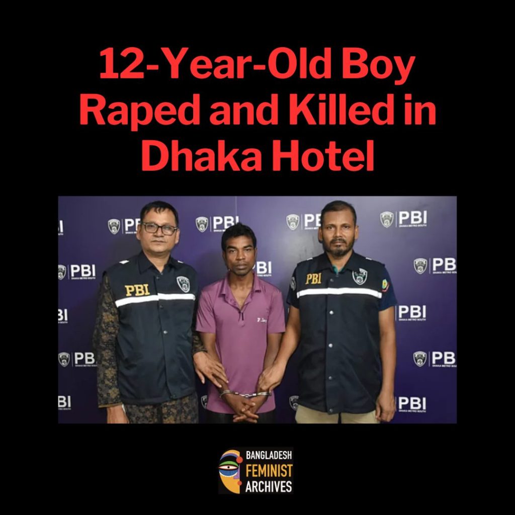 A 12-year-old boy was brutally raped and murdered in a hotel room in Jatrabari, Dhaka. According to the Police Bureau of Investigation (PBI), two men lured the child from Kamalapur railway station by offering food and shoes. They later took him to a residential hotel named ‘Anwara’ on July 14.