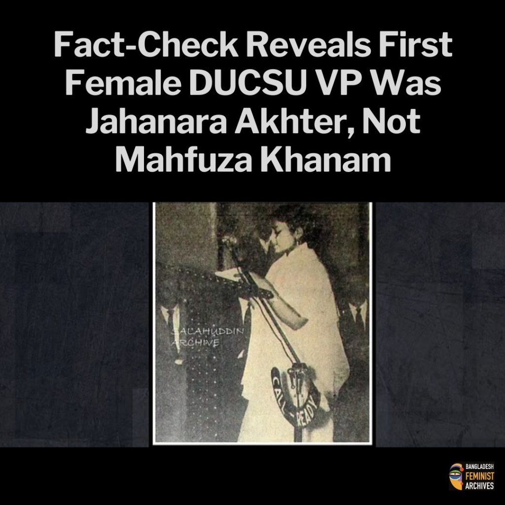 Archival newspapers and records show that Begum Jahanara Akhter was elected DUCSU VP in the 1960–61 academic session, making her the first woman to hold the post. Mahfuza Khanam was later elected in the 1967–68 session. Dismislab also noted that claims of DUCSU having only one female VP in its history are incorrect.