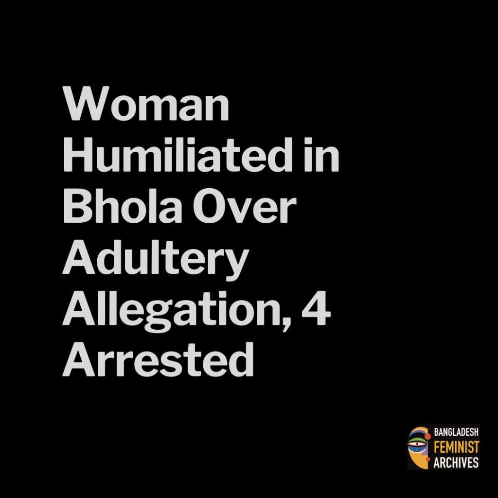 In Bhola’s Borhanuddin upazila, a woman was publicly humiliated after being accused of adultery. Her hair was cut off and a garland of shoes was placed around her neck in the Notun Bazar area of Ward No. 5, Manika Union. Police have since arrested four people in connection with the incident.