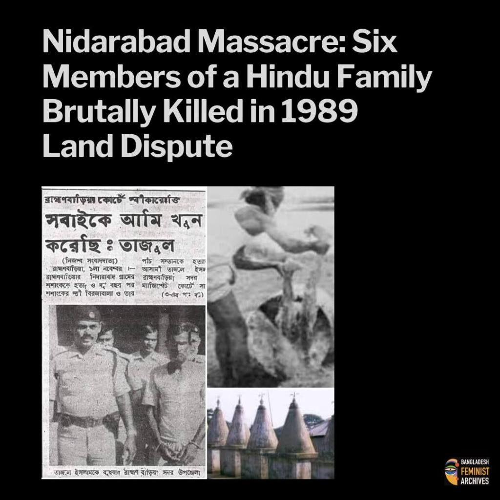 On the night of 6 September 1989, a horrific massacre took place in Nidarabad village of Nasirnagar upazila, Brahmanbaria, when a Hindu woman and her five children were murdered by a local mob. The victims, Birajabala Debnath and her children, aged between a few months and mid-teens, were dragged from their home and killed by a group of 15–20 men led by local land grabbers attempting to seize the family’s ancestral property.