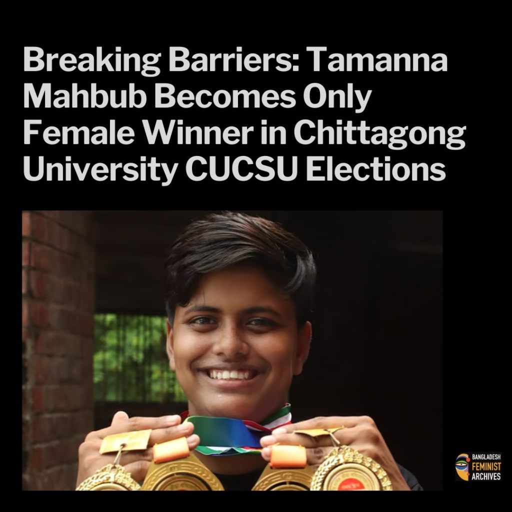 Tamanna Mahbub, a fourth-year student of the English Department at Chittagong University, has made history by becoming the only female winner in the recently held Central Students’ Union (CUCSU) elections. Competing against 13 other contenders, she was elected Co-Sports Secretary, standing out as the sole woman candidate for the position.