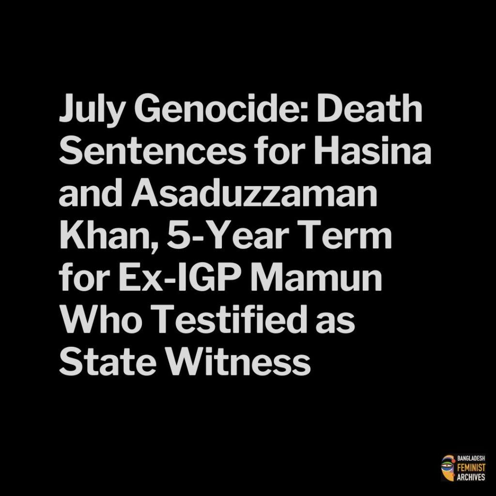 The International Crimes Tribunal has sentenced ousted Prime Minister Sheikh Hasina and former Home Minister Asaduzzaman Khan Kamal to death for crimes against humanity committed during the July–August genocide and mass uprising. Former IGP Chowdhury Abdullah Al-Mamun—who confessed and testified as a state witness—was sentenced to five years. This is the first verdict delivered by the reconstituted tribunal since the fall of the Awami League government on August 5, 2024.