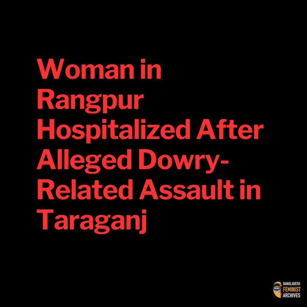 A 20-year-old woman has been hospitalized in Taraganj, Rangpur, after allegedly being beaten by her husband and in-laws over dowry demands. The incident occurred on Tuesday morning in Baniapara village of Alampur union. The survivor, Aduri Khatun, is currently receiving treatment at the Taraganj Upazila Health Complex.