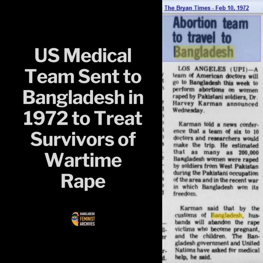 In February 1972, just weeks after Bangladesh won independence, a team of American doctors prepared to travel to the country to provide abortions for women raped by Pakistani soldiers during the Liberation War. According to The Bryan Times (Feb 10, 1972), Dr. Harvey Karman announced that six to ten physicians and researchers would go at the request of the Bangladesh government and the United Nations. He estimated that as many as 200,000 Bangladeshi women had been raped during the occupation, noting that social customs often led husbands to abandon women who became pregnant through rape, leaving survivors and newborns extremely vulnerable.