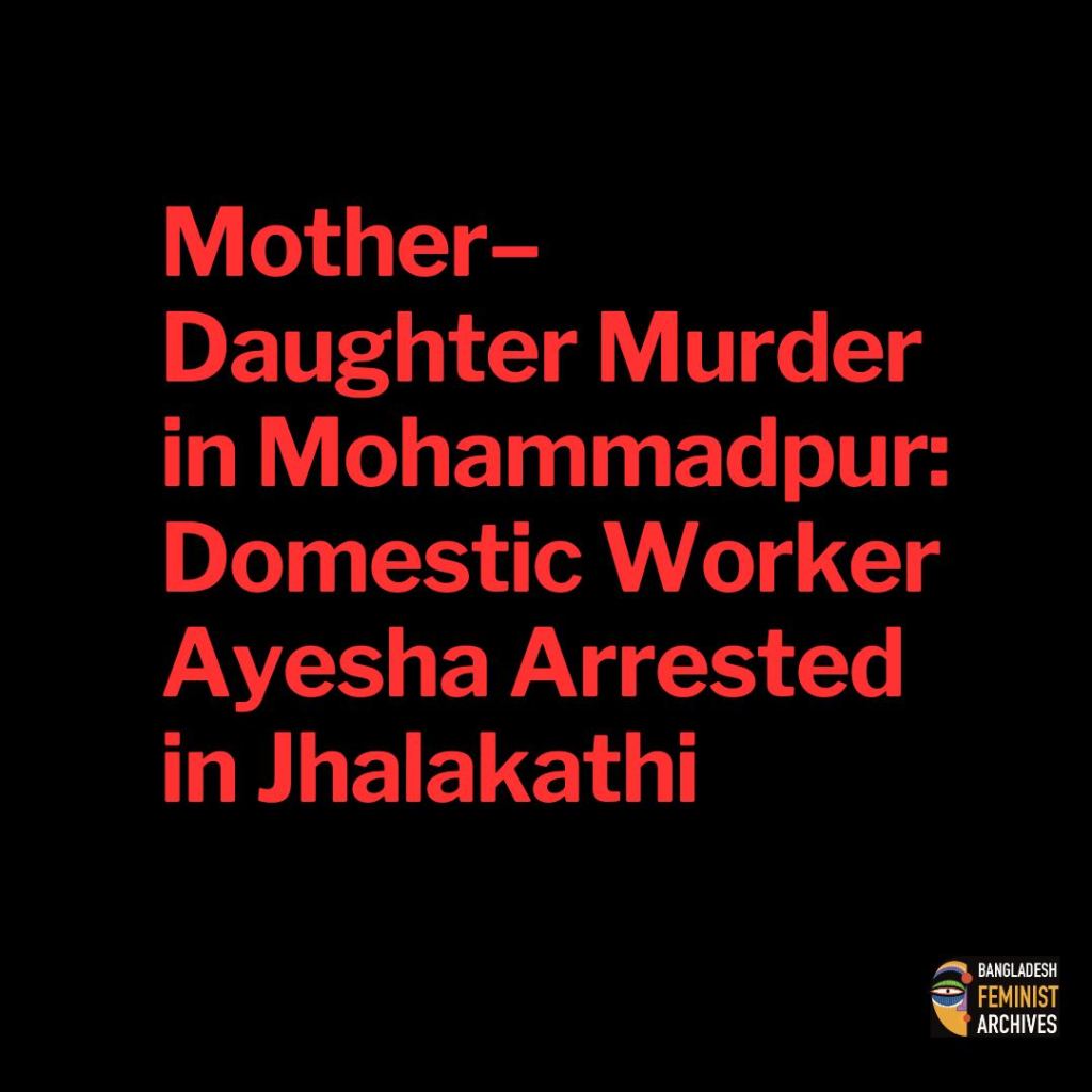 Police have arrested domestic worker Ayesha in connection with the murder of 48-year-old Laila Afroz and her 15-year-old daughter, Nafisa Lawal binte Aziz, who were found with their throats slit in their Mohammadpur home on Monday. Mohammadpur Zone ADC Jewel Rana confirmed that Ayesha was detained from Nalchiti in Jhalakathi on Wednesday, along with her husband Rabbi. Police also recovered a laptop from them.