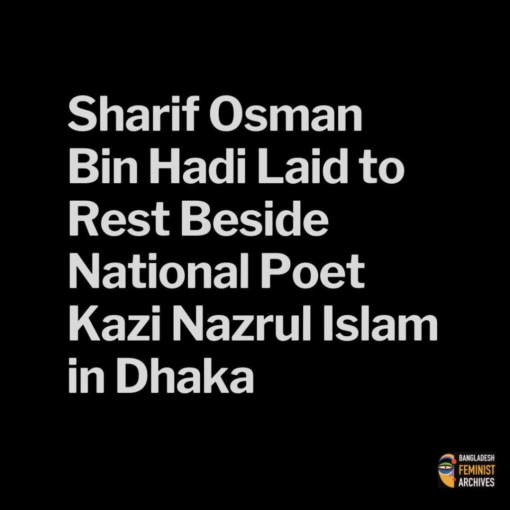 The burial of Sharif Osman Bin Hadi, convener of the Inqilab Manch and a leading figure of the July mass uprising, was completed around 4:00 pm on Saturday, December 20, in Dhaka. He was laid to rest beside the mausoleum of Kazi Nazrul Islam, next to the Dhaka University Central Mosque.