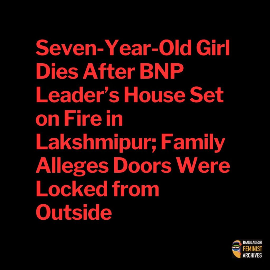 A seven-year-old girl, Ayesha Akter, died in a fire after the house of a local BNP leader was set ablaze in Char Mansa village of Bhavaniganj Union, Lakshmipur Sadar upazila, early Saturday morning, December 20, family members and police said. The family alleged that miscreants locked the house from the outside, poured petrol, and set it on fire while the occupants were asleep.