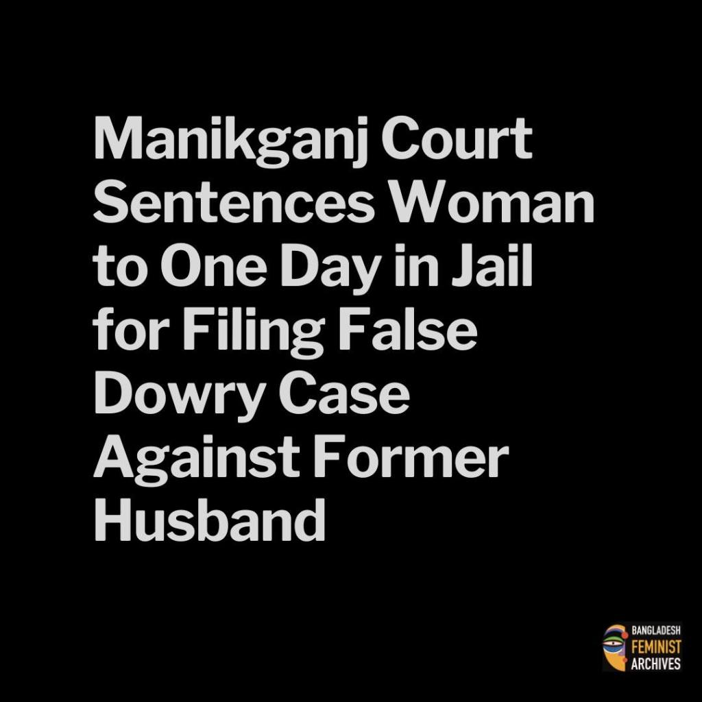 The Chief Judicial Magistrate Court of Manikganj has sentenced a woman to one day of imprisonment for filing a false dowry case against her former husband. The verdict was delivered on Monday afternoon, December 22, by Judge Mamun Hasan Khan, court sources said.