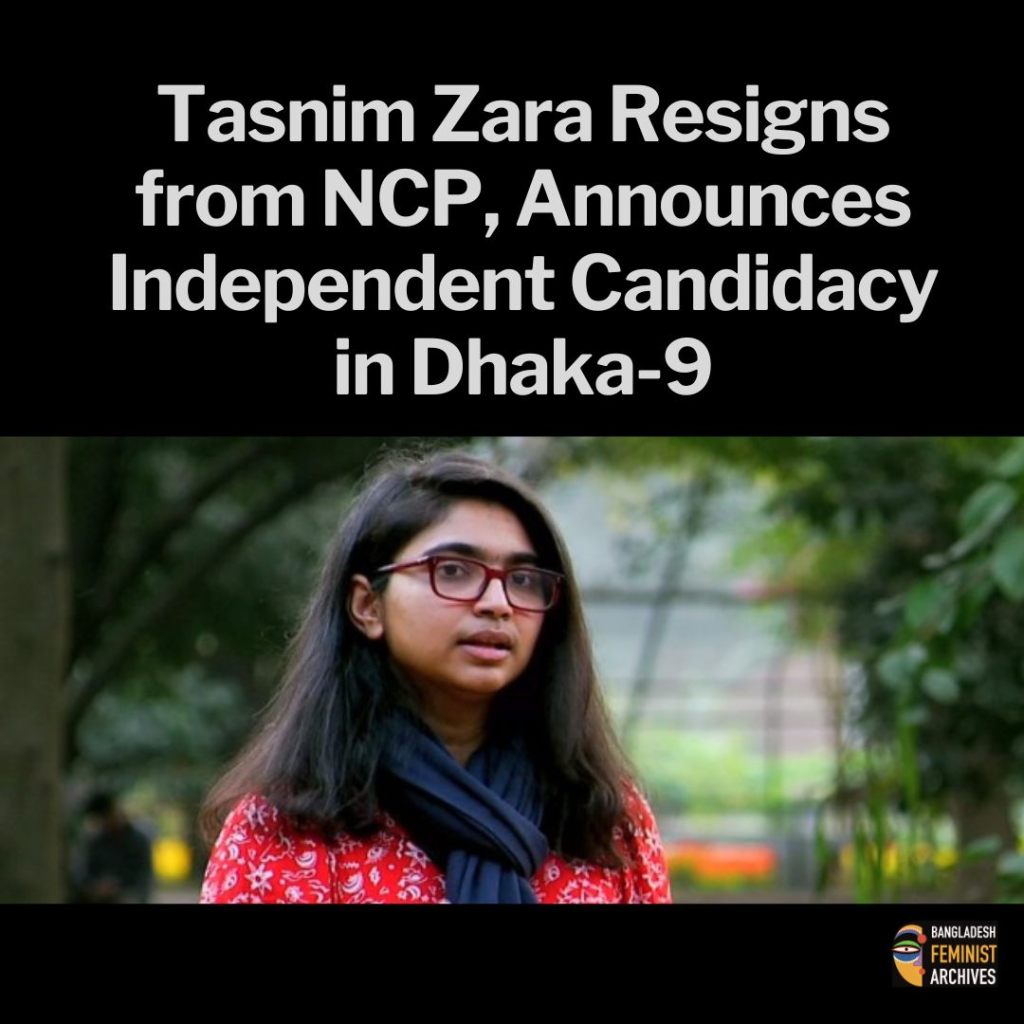 Tasnim Zara, senior joint member secretary of the National Citizens Party (NCP), has resigned from the party and announced her decision to contest the 13th national parliamentary election as an independent candidate from the Dhaka-9 constituency. The resignation was confirmed on Saturday evening by NCP senior joint convener Samanta Sharmin.
