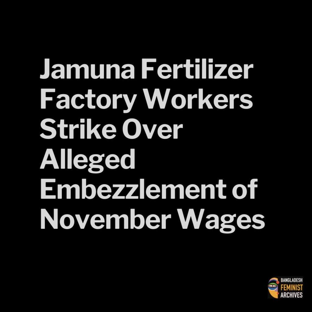 Daily wage workers at Jamuna Fertilizer Factory in Jamalpur staged a protest on Saturday, alleging that their November wages were embezzled by a contractor appointed by the factory authorities. The workers blocked the main gate of the factory in the Tarakandi area of Sarishabari upazila and observed a strike for nearly four hours.