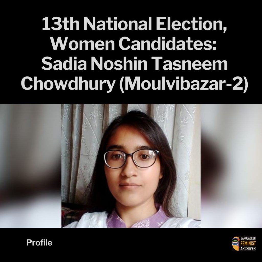 Sadia Noshin Tasneem Chowdhury is contesting the 13th National Election from Moulvibazar-2 (Kulaura Upazila) as a candidate of the Socialist Party of Bangladesh (SPB), with the symbol scissors. Among 26 valid candidates in the district, she is the only woman candidate.