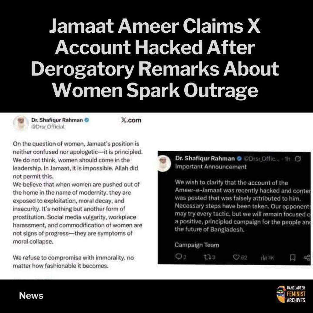 During the period of unauthorized access, a post containing remarks derogatory toward women was published from the account and circulated online. Jamaat-e-Islami stated that the content was false, fabricated, and does not represent any statement or position of Dr. Shafiqur Rahman. The party condemned the spread of the post and described it as misleading.