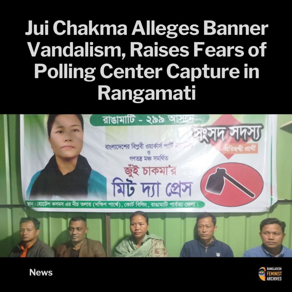 Jui Chakma, candidate of the Revolutionary Workers Party in the Rangamati constituency, alleged that her campaign banners and festoons were torn and expressed fears of polling center capture on election day. She made the claims at a “Meet the Press” event at the election office in the court building area of Rangamati town on Monday evening.