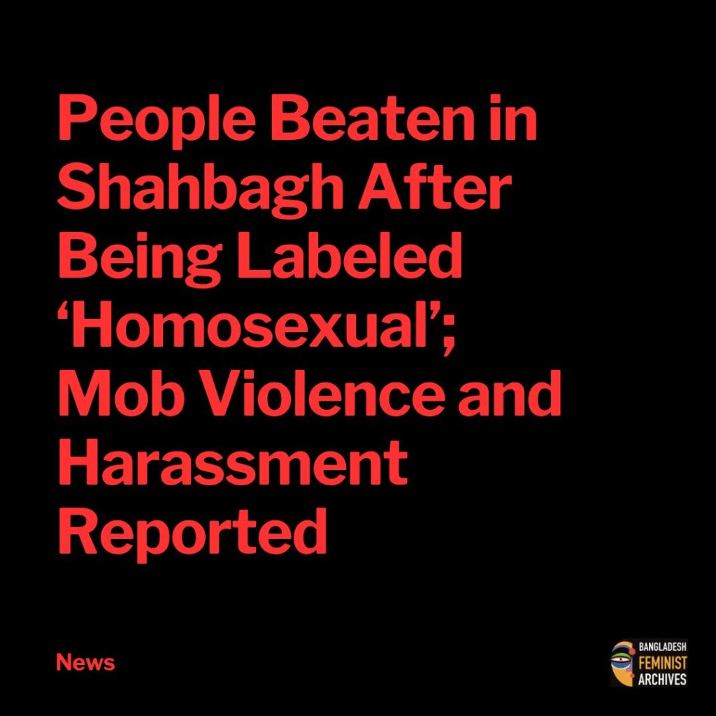 Several individuals were assaulted near Shahbagh in Dhaka on Friday evening after being labeled “homosexual” by a group identifying itself as “Azadi Andolon.” Those attacked stated that they had not provoked the incident and reported that women in the group were also subjected to sexual harassment.