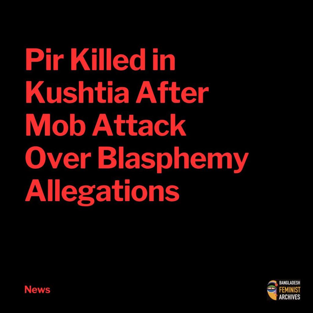 A pir (spiritual leader), Shamim Reza, also known as Jahangir, was beaten and hacked to death in Kushtia’s Daulatpur Upazila after a mob attacked his shrine following allegations of blasphemy linked to an old video. The incident took place on April 11 in Philipnagar village, where the shrine was also vandalized and set on fire.
