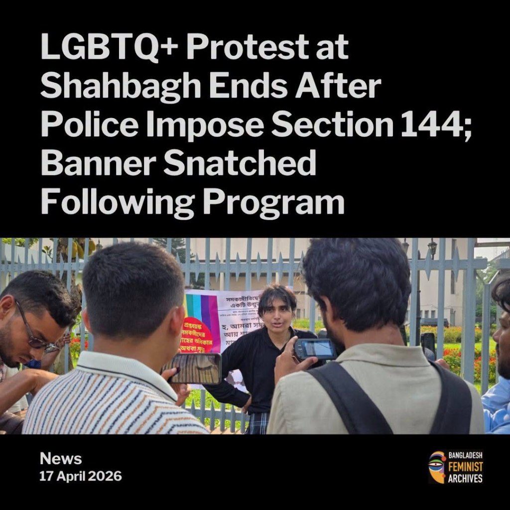 A group of LGBTQ+ activists staged a sit-in protest at Shahbagh on April 17, led by organizers including Sahara Choudhury Rabil and Siam, protesting mob harassment and demanding recognition of their rights. The program ran from 11:00 AM to 4:00 PM, drew participation from supporters, and maintained a visibly assertive tone despite a tense environment. Protesters remained on-site until the scheduled conclusion.