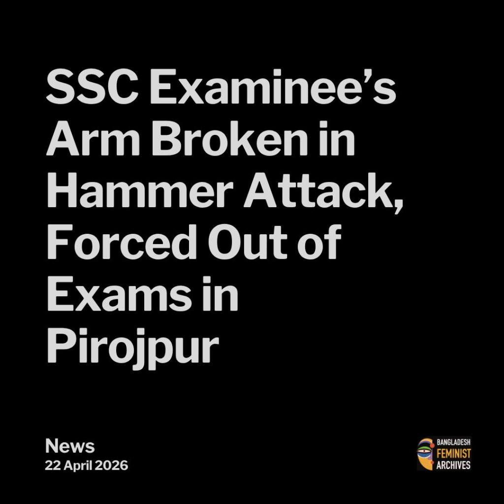A 15-year-old SSC examinee was seriously injured in Mathbaria Upazila of Pirojpur after being attacked with a hammer during a family dispute, leaving her unable to sit for her ongoing exams. The incident took place on Tuesday afternoon in Shakharikathi village under Tushkhali Union.