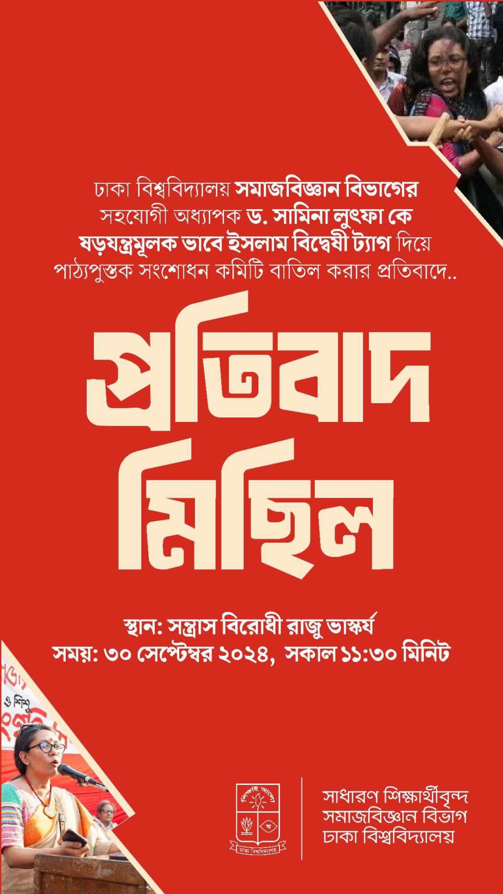 ঢাকা বিশ্ববিদ্যালয় সমাজবিজ্ঞান বিভাগের সহযোগী অধ্যাপক ড. সামিনা লুৎফা কে ষড়যন্ত্রমূলকভাবে “ইসলাম বিদ্বেষী” ট্যাগ দিয়ে পাঠ্যপুস্তক সংশোধন কমিটি বাতিল করার প্রতিবাদে ঢাকা বিশ্ববিদ্যালয় সমাজবিজ্ঞান বিভাগের আয়োজনে সাধারণ ছাত্র-জনতার প্রতিবাদ মিছিল। ড. সামিনা লুৎফার শিক্ষার্থীরা বলেছেন: শিক্ষার্থী হিসেবে ড. সামিনা লুৎফার বস্তুনিষ্ঠতার সাক্ষী তারা। শিক্ষার্থীরা মনে করেন একটা সমাজকে সবথেকে ভালো জানেন এবং বোঝেন একজন সমাজবিজ্ঞানী,…